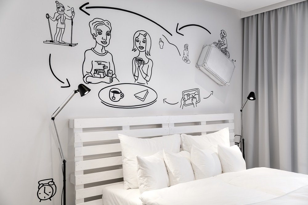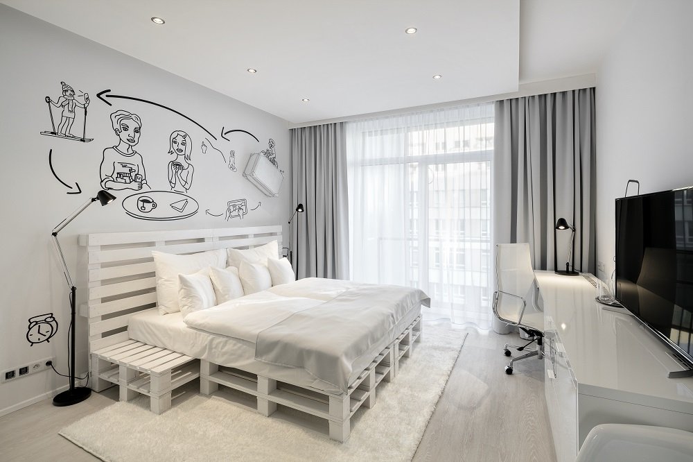 "Pokoje vznikaly společně, částečně na cestě. Protože hodně cestuji, chtěl jsem si splnit sen a udělat designroom pro věčné cestovatele, globettrotery. Takové místo, kde se na chvíli zastavím, zamyslím, odpočinu si, než pojedu dále. Chtěl jsem lehký, minimalistický design, takový cestovatelský "LAB", kde není nic zbytečného, předesignovaného," popisuje Michal Kunc svůj záměr. Inspiroval se ulicemi měst a míst, kde pobýval, i vzkazy cestovatelů na zdech pokojů, grafitti na stěnách v průchodech či starými časopisy. Pokoj je laděný do "street style": s kresbičkami, vzkazy, vtipy a mezinárodně srozumitelnými piktogramy. Celkové zpracování a realizace proběhla pod taktovkou Ing. arch. Jany Šandallové. Grafiku navrhl Zdeněk Häckl. Volil černobílou grafiku, která koresponduje s čistotou jinak bílého pokoje. Zajímavým prvkem pokoje jsou postele, které jsou tvořené paletami natřenými na bílo. Bílou barvu v koupelně skvěle doplňuje dřevěná podlaha i čelní stěna za umyvadlem, která je osazena několika různě velkými zrcadly.