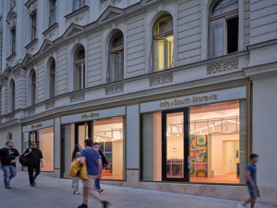 V rámci památkově chráněného objektu hledal návrh rovnováhu mezi uchováním historické podoby a novým aktivním využitím. Nové architektonické zásahy respektují původní rytmus budovy, kterou v minulosti ovlivnil jak svažitý terén, tak řada nahodilých úprav. Nově vytvořené otvory navazují na původní tektoniku stavby, odstranění parapetů pak fyzicky i vizuálně propojuje infocentrum s pulzujícím veřejným prostorem. Lehce předsazené zasklení sjednocuje označení provozů, zlepšuje přístupnost a přispívá k celkové kultivaci fasády. Řešení vzniklo ve spolupráci s Národním památkovým ústavem a Odborem památkové péče města Brna. Umístění značení vychází z Manuálu dobré praxe reklamy a označování provozoven (Brno-střed, 2018, Veronika Rút). V centru města, kde často převládá vizuální smog a nahodilé výlohy, přináší tento přístup srozumitelnost a uměřenost – jako nástroj veřejného vzdělávání i kvality městského prostoru.
