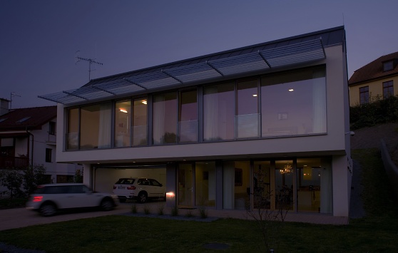A plot in a closed courtyard with an elevation and an already issued zoning decision originally for a different house. That was the brief. And the result? Within the already established dimensions of the house volume, we shift the floor forward and create shading for the ground-floor living spaces from the low western sun. This simple principle creates a back private terrace to the garden, which is, however, at a higher level due to the elevation of both parts of the plot. The simple silhouette of the new house respects the established gabled roof, and the full sides create intimacy in contrast to the full glazing towards the garden behind the house and the green areas in front of the house. Rendered plaster, aluminum windows, metal roof, wooden oak floors, and transparency towards the east-west.