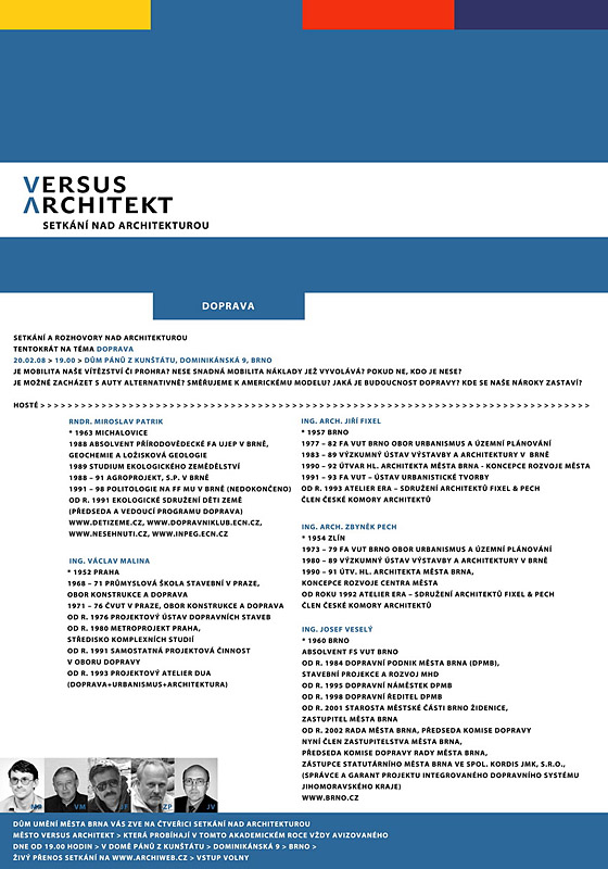 The meeting TRANSPORTATION VERSUS ARCHITECT is held on Wednesday, February 20, 2008, at 7:00 PM at the premises of the House of Lords from Kunštát, Dominikánská Street 9, Brno, free entry