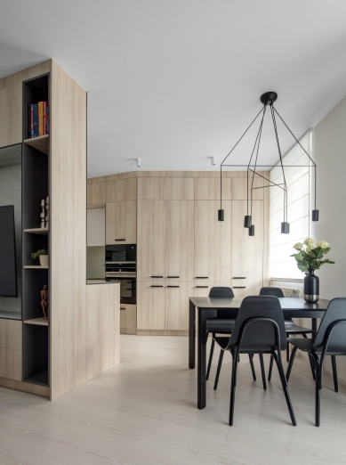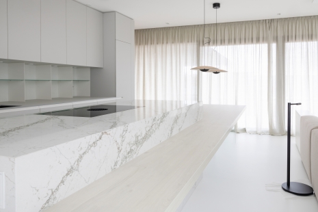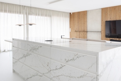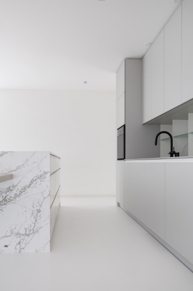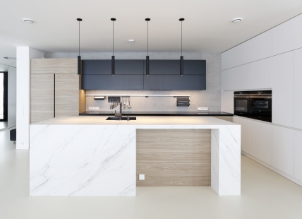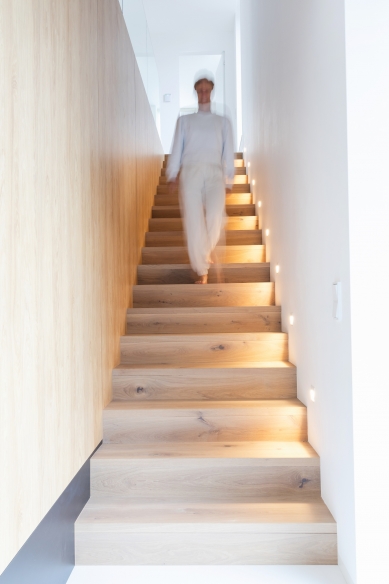 Celý interiér je harmonicky sladěný ve světlých tónech kombinující přírodní materiály jako dřevěný obklad stěny, bílý mramor na ostrůvku kuchyně, bezúchytové linie, antracitové detaily, dubové schodiště, jemné lněné závěsy a světlé čalounění.