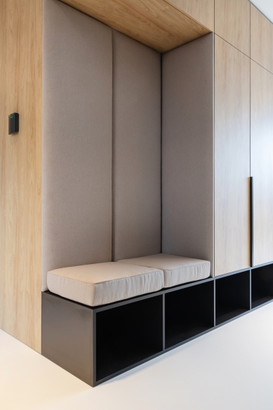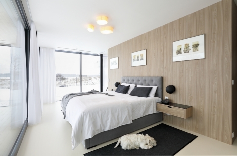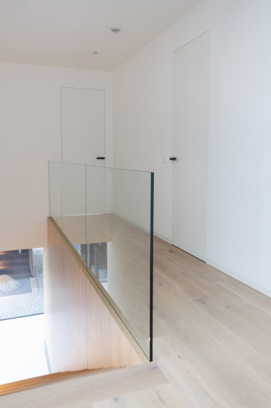Intimita obývacího pokoje vznikla díky zahradě, kdy exteriér zahrady doslova vrůstá do obývacího pokoje a zároveň dává majitelům dostatečné soukromí. Aby tato privátní část byla maximálně odstíněna od okolí, je část obývacího pokoje od uliční strany odstíněna posuvnými kovovými paravány.