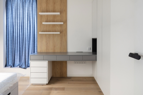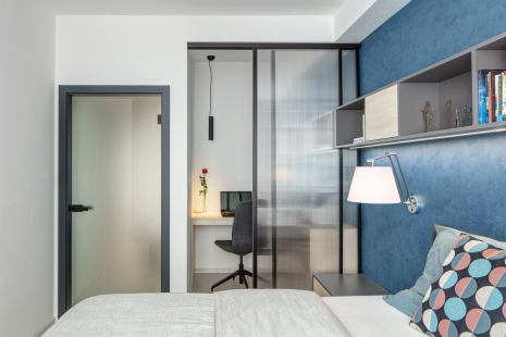 Interiér je opakem vnějšku, tedy je zde využita kombinace bílých barev, stěrek a obkladů stěn s laminátovými deskami v dřevodekoru. V koupelnách jsou chromové doplňky. Kombinace měkkých tónů od bílé, přes dřevodekory až po tištěnou velkoplošnou grafiku na skle dávají interiéru kompaktní a přívětivý výraz.