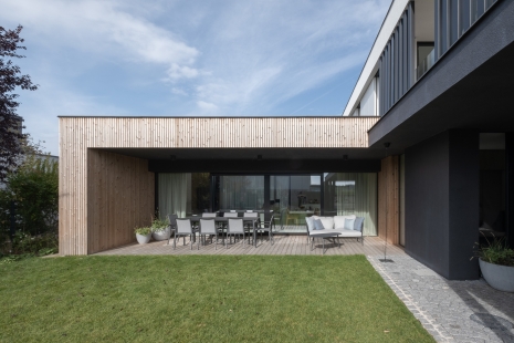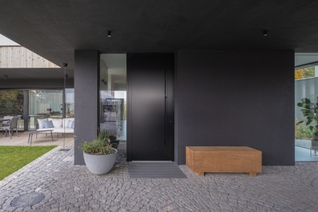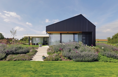 Obývací pokoj je přisazený k hlavní hmotě a tvoří tak půdorysnou kompozici ve tvaru písmene T. Kombinace masivního, černého bloku s lehkou, nehmotnou a prosklenou částí dává domu dynamiku a autentický výraz.