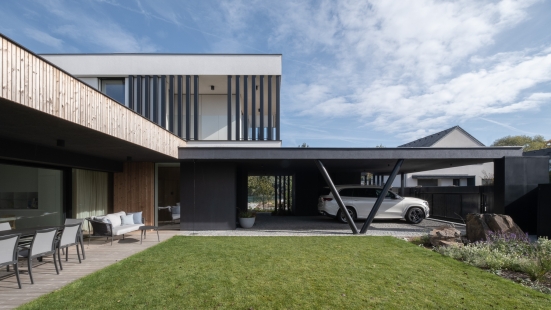 Dům propojuje přírodní materiály, například dřevěný obklad a kamenné prvky, s antracitovými detaily a minimalistickým designem. Dominantou je elegantní ocelová konstrukce parkovacího stání, která zdůrazňuje technickou vyspělost celé stavby.
