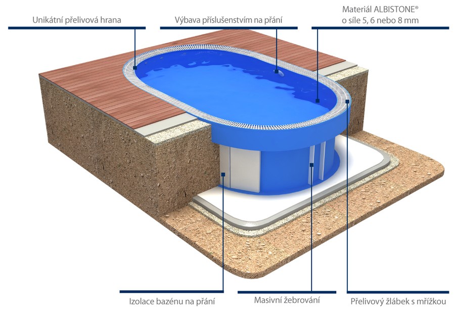 Budování vlastního bazénu je investicí. Vhodně zvoleným materiál se zárukou skutečné dlouhé životnosti jistě přesvědčí každého rozumného zákazníka. Nevyplatí se stavět s levným materiálem, který si vyžádá opakované opravy nebo dokonce technicky náročnou a neméně drahou výměnu. ALBISTONE® je moderní, kvalitní a nejvhodnější trvalou volbou.