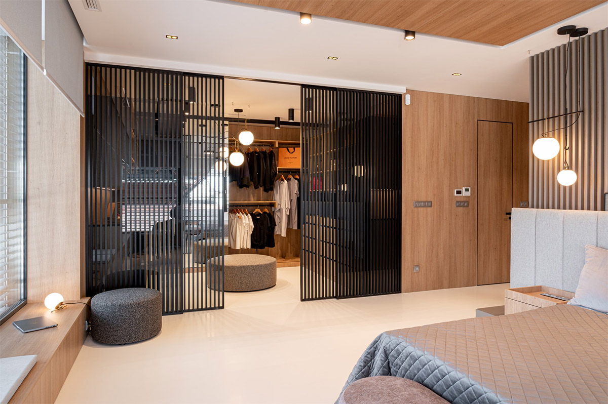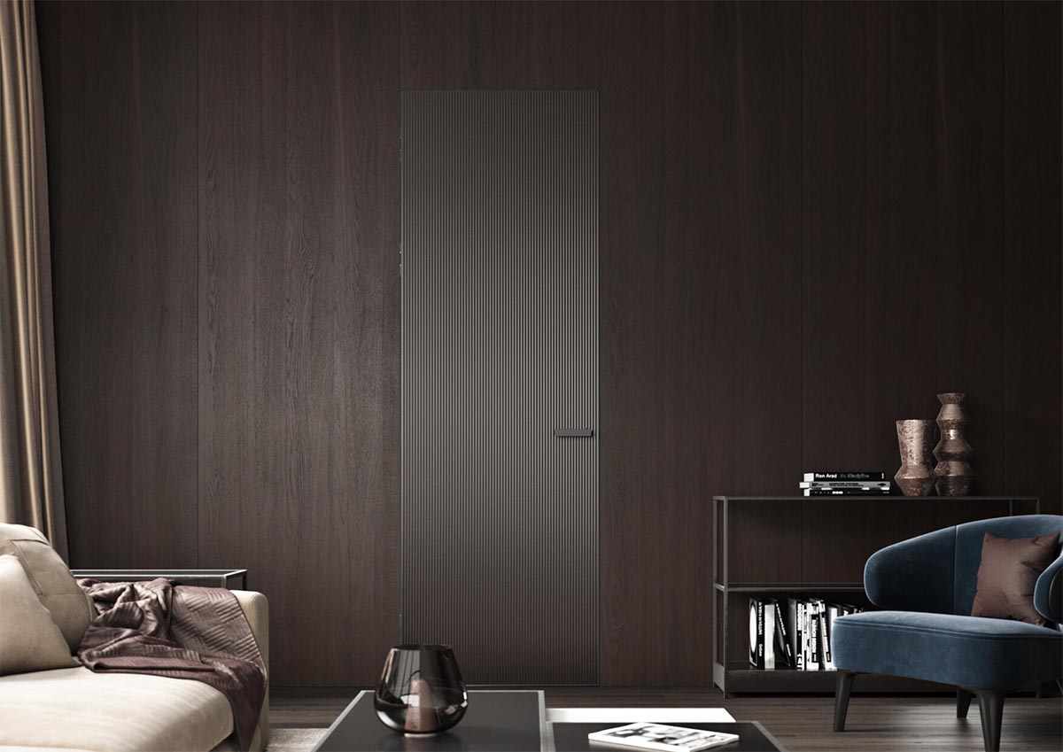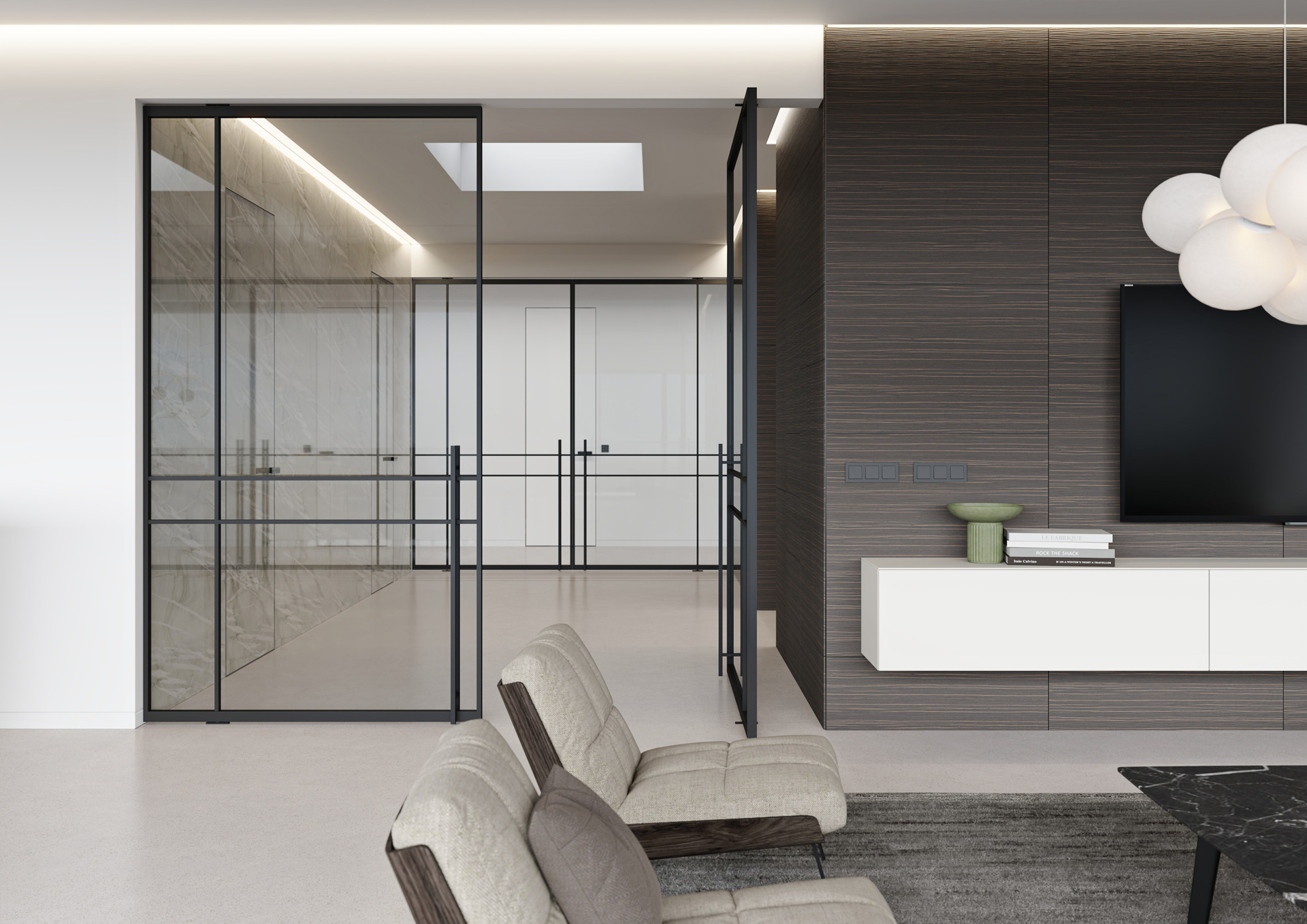 | Otočné dveře MASTER se sklem Flutes, skrytá zárubeň a obkladový systém EFEKTA |