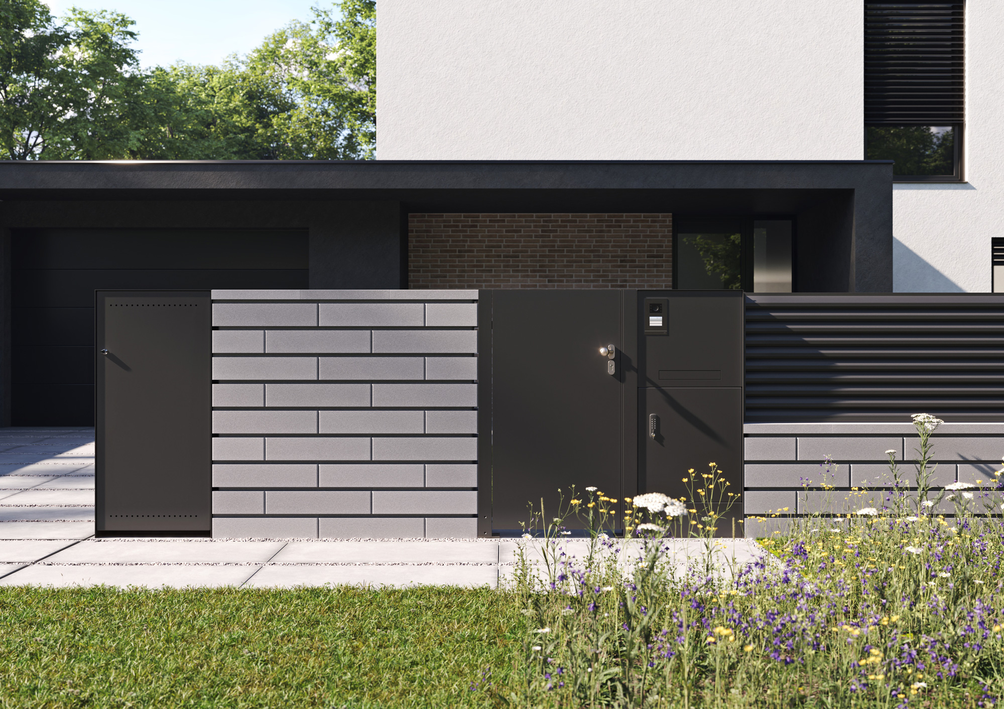 | V plotu zleva modul CLEANNY - uložení nádoby na odpad, GATIE - branka, FULL - box na ukládání balíku se schránkou a přípravou na zvonek a vchodovou skrytou kameru, případně samostatného štítku LABEL |