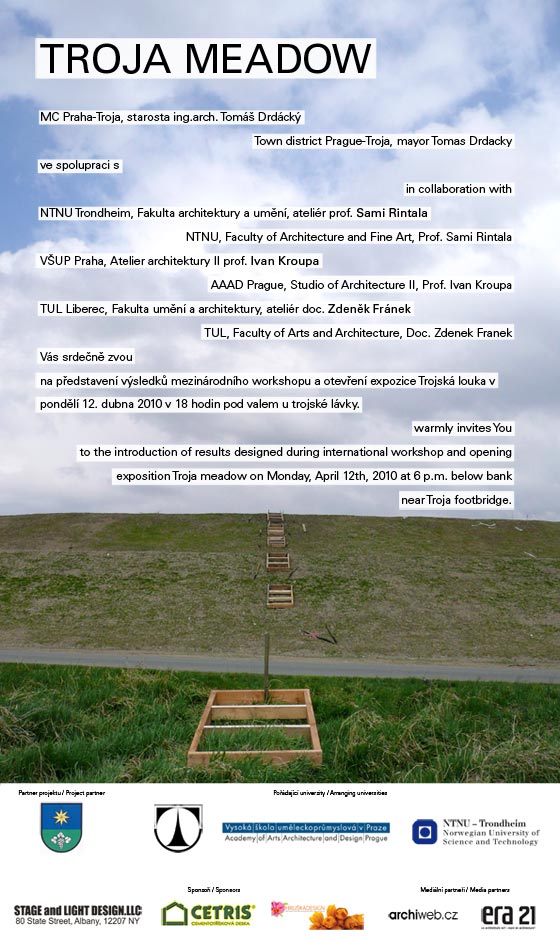Town district Prague-Troja, mayor Tomas Drdacky in collaboration with NTNU, Faculty of Architecture and Fine Art, Prof. Sami Rintala AAAD Prague, Studio of Architecture II, Prof. Ivan Kroupa TUL, Faculty of Arts and Architecture, Doc. Zdenek Franek warmly invites You to the introduction of results designed during international workshop and opening exposition Troja meadow on Monday, April 12th, 2010 at 6 p.m. below bank near Troja footbridge.